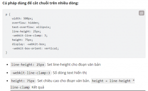 Cú pháp dùng để cắt chuỗi trên nhiều dòng: [crayon-6933ae3ecfdeb975939634/] line-height: 25px: Set line-height cho đoạn văn bản -webkit-line-clamp:3: Số dòng text hiển thị...