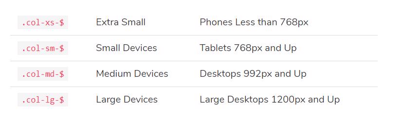 Số pixel là điểm dừng, vì vậy, ví dụ như col-xsnhắm mục tiêu phần tử khi cửa sổ nhỏ hơn 768px (có thể là thiết bị di động) …